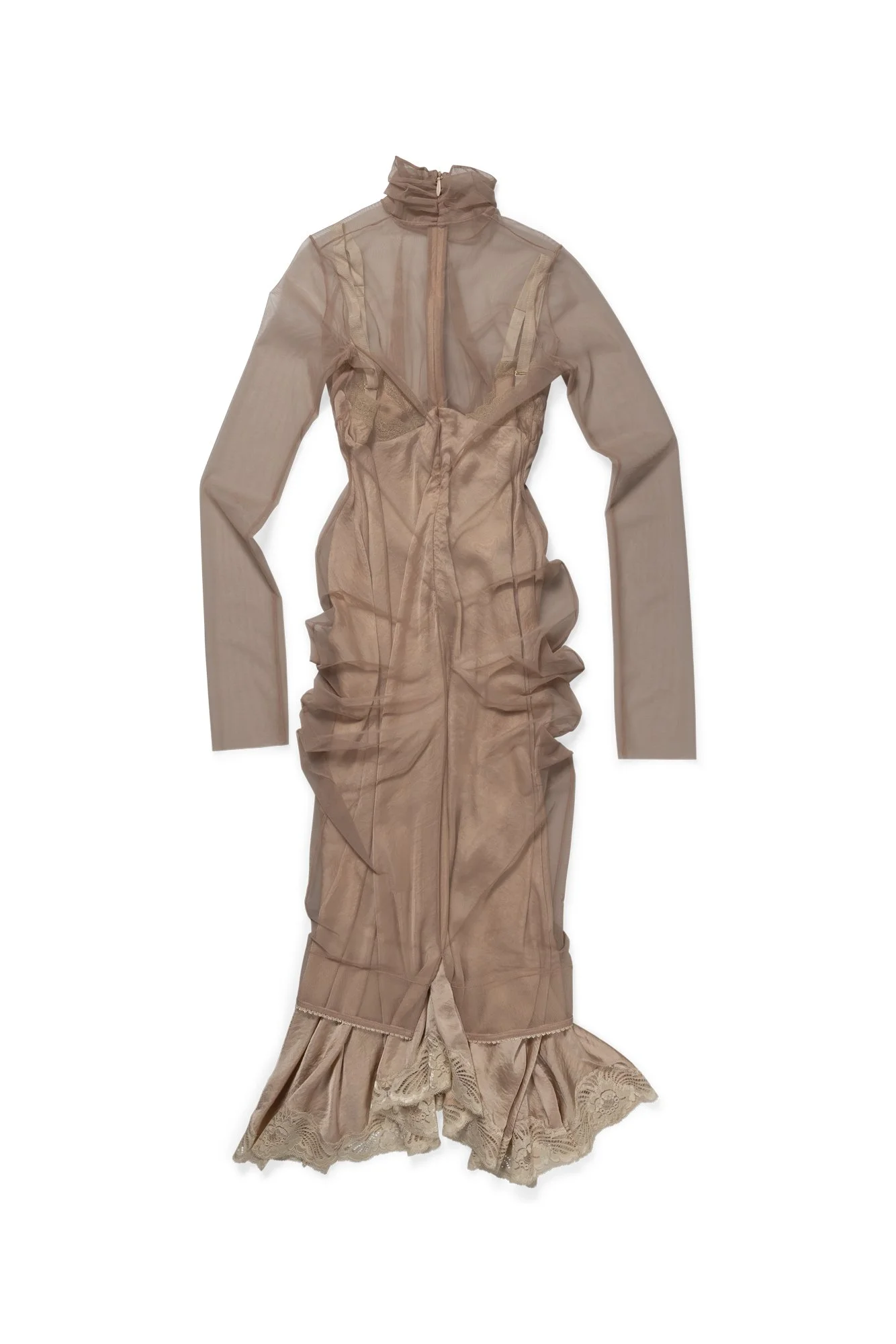 The styling is intentionally organic, allowing gravity and texture to do their work. A slightly off-centre button line, a corset string that refuses to lie flat—those details make the garment feel alive.